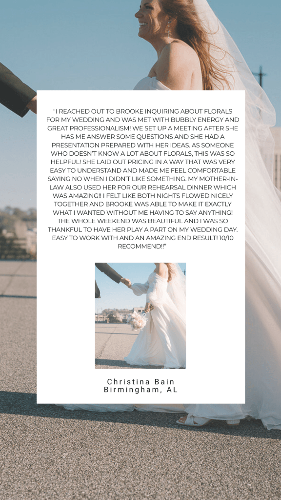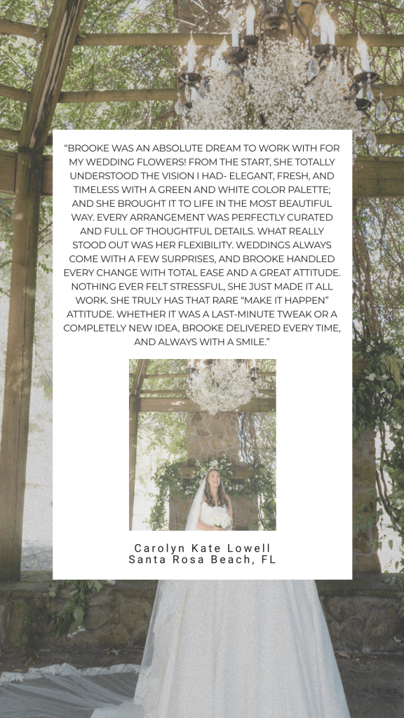 Founded in 2016, Brooke and Blossoms has grown from a college passion project into a premier floral design studio serving the southeast. With a focus on seasonal blooms, distinctive palettes and thoughtful, story-driven arrangements, Brooke has had the privilege of designing florals for weddings, engagements, baby showers, and special events across the region. Every arrangement is crafted to reflect the client’s vision and bring life, beauty, and meaning to every moment.